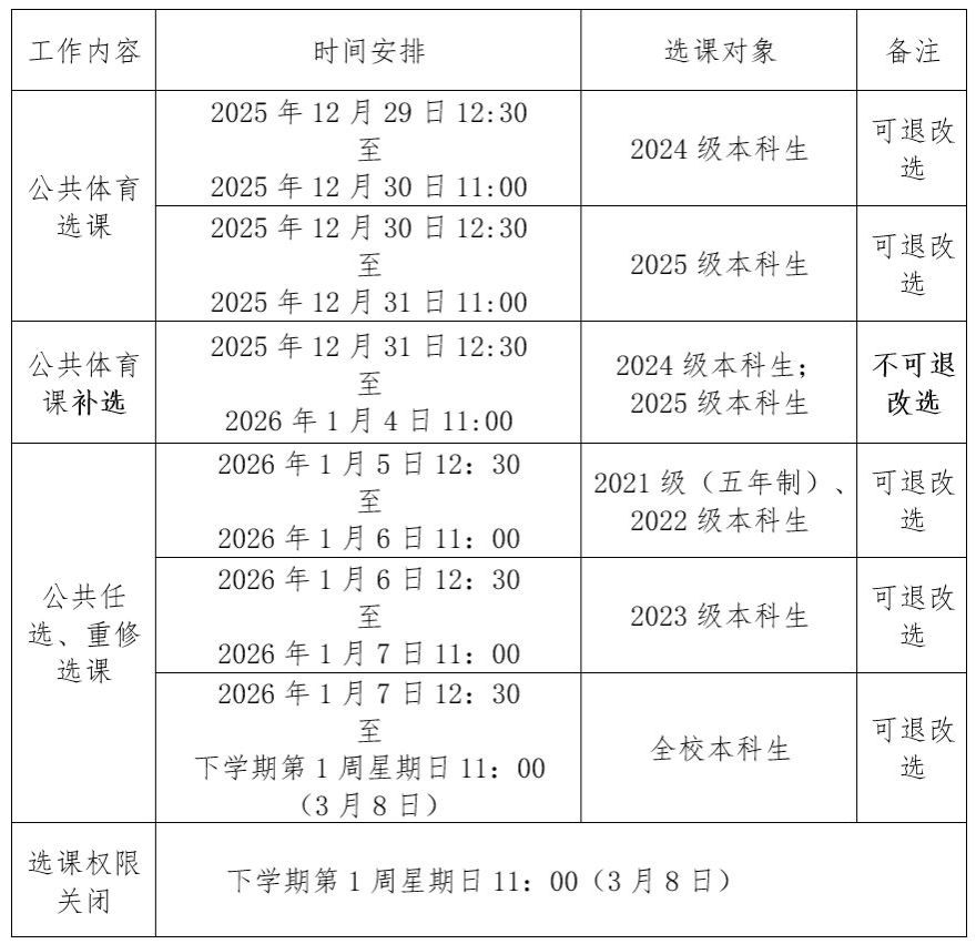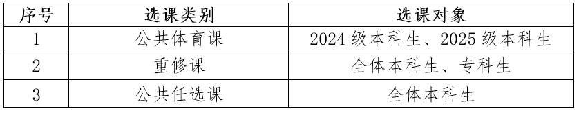 各学院: 2025-2026学年第二学期本科生公共体育、重修及公共任选课网上选课将于2025年12月29日(第18周星期一)中午12:30开始,现将相关事项通知如下: 一、选课类别及选课对象